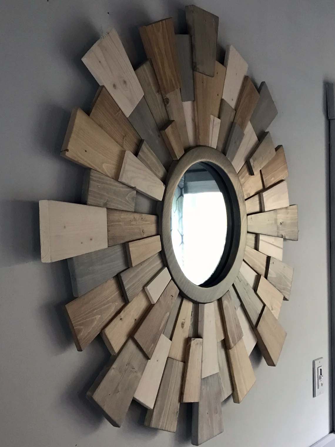 This beautiful sunburst mirror was designed and created to portray a vintage yet very modern look. With its broken up dimensional pieces and scattered multi- colored wood tones, this piece definitely grabs your attention. Its smooth, sleek finish and crisp square edges add to its modern charm.