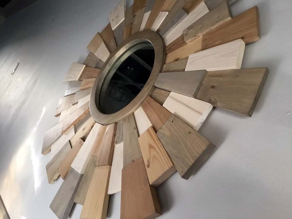 This mirror is 38 “ in total diameter and has a 12''mirror in it's center, it would make a beautiful addition to any wall space. If you are interested in a custom mirror please contact us.