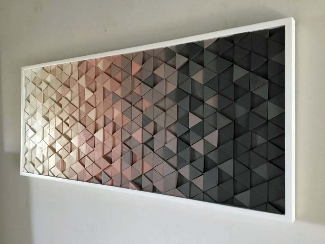 This beautiful geometric wood wall sculpture is composed of multi dimensional cut triangles placed into the design and colored with gradient fade in vintage tones of gray, mauve, pink, cream and white also finished with a handcrafted crisp white frame. This piece could also be customized in regards to size and color modification. Feel free to contact.