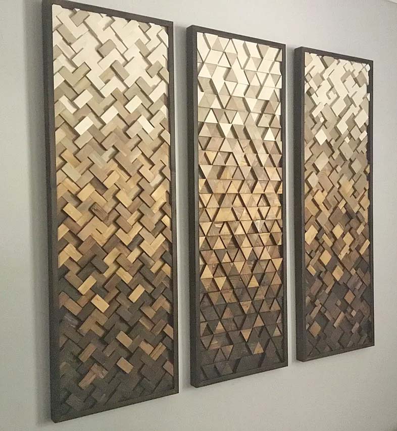 This amazing 3 panel set incorporates 3 separate multi dimensional design patterns ( herringbone, triangles and fractioned squares). All three have the same cohesive gradient trickling fade through multi tones of natural browns and grays ending in white measuring a total display size of roughly 4ft x 5ft. depending on display orientation ( see lineup photos for both options).