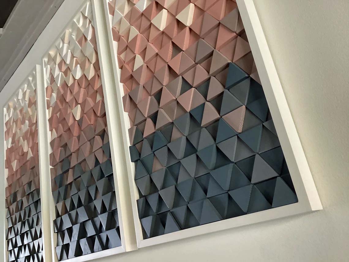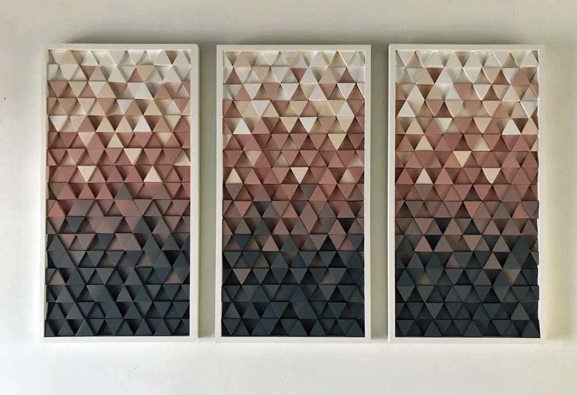 This beautiful geometric 3pc. wood wall sculpture is composed of multi dimensional cut triangles placed into the design and colored with gradient fade in vintage tones of gray, mauve, pink, cream and white also finished with handcrafted crisp white frames. This piece could also be customized in regards to size and color modification. Feel free to contact.