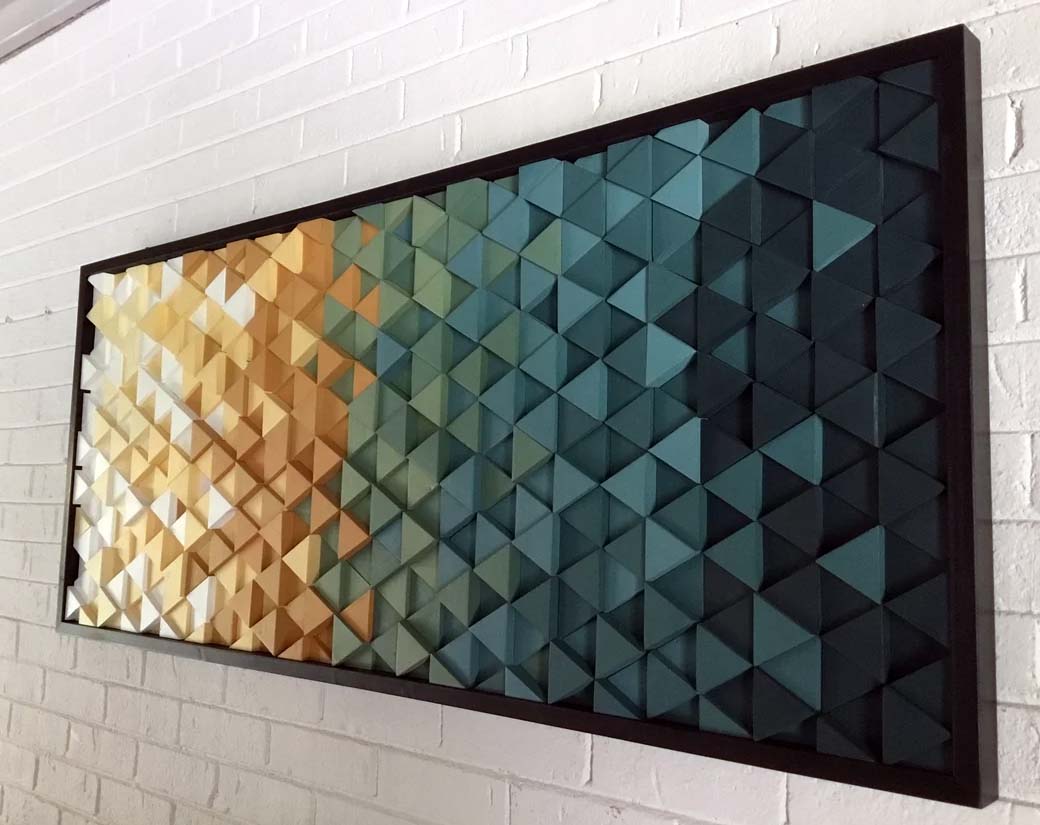 This beautiful geometric wood wall sculpture is composed of multi dimensional cut triangles placed into the design and colored with gradient fade in tones of blue, green, orange, yellow and white also finished with a handcrafted stained black frame. This piece could also be customized in regards to size and color modification as well. Feel free to contact.
