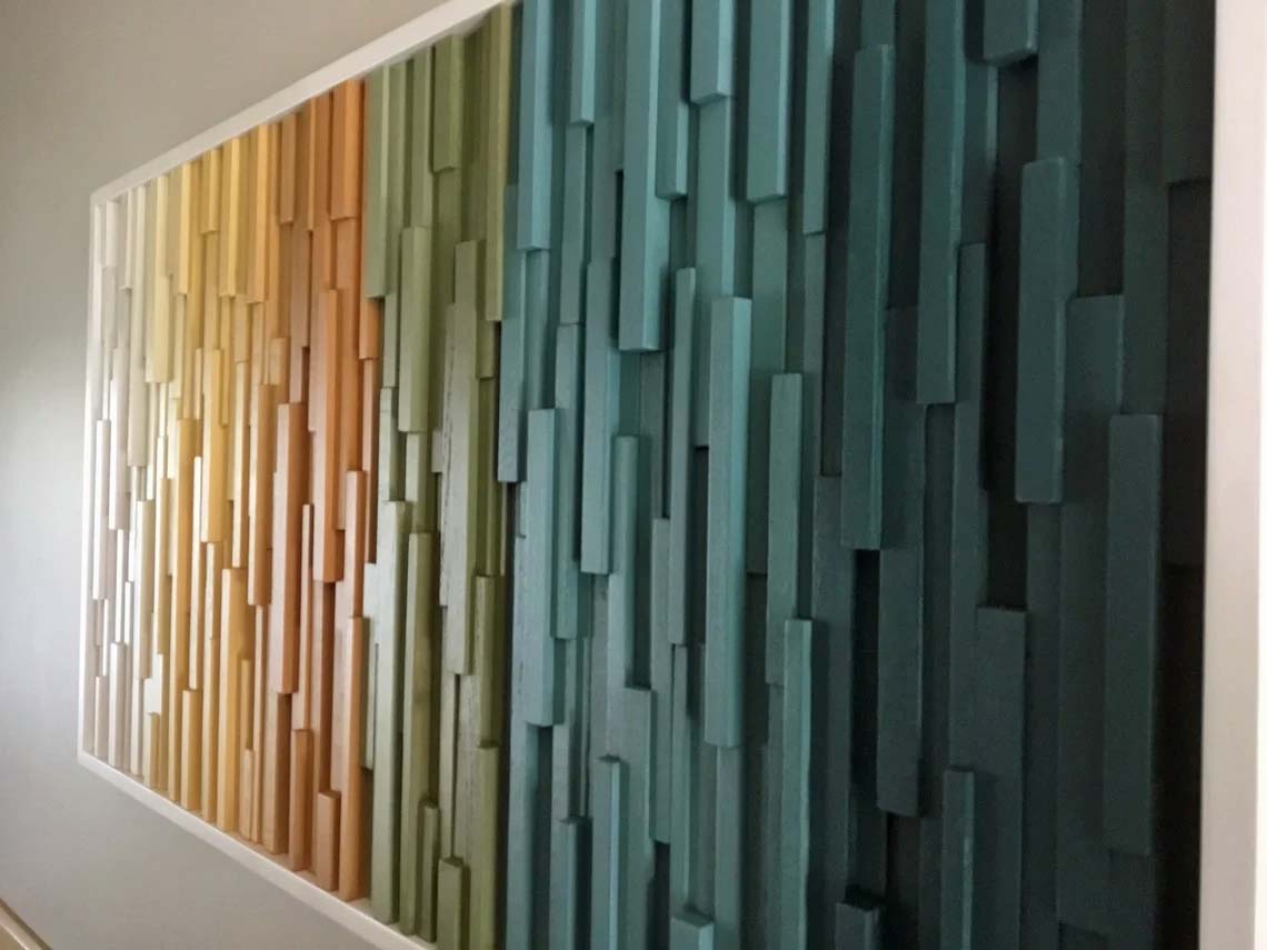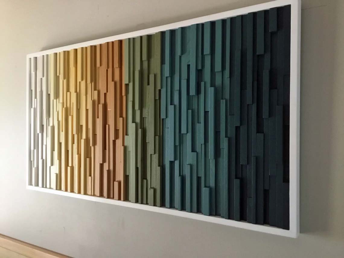 Handcrafted modern wood wall art piece that is made out of reclaimed and up cycled wood. To achieve this sculpture each piece of wood had to be individually ripped, cut, sanded, painted and assembled. This piece would be the focal point of any space whether it be home or office. The beginning is a gradient fade through multiple earthy tones of white, yellow, orange, green , and blue.