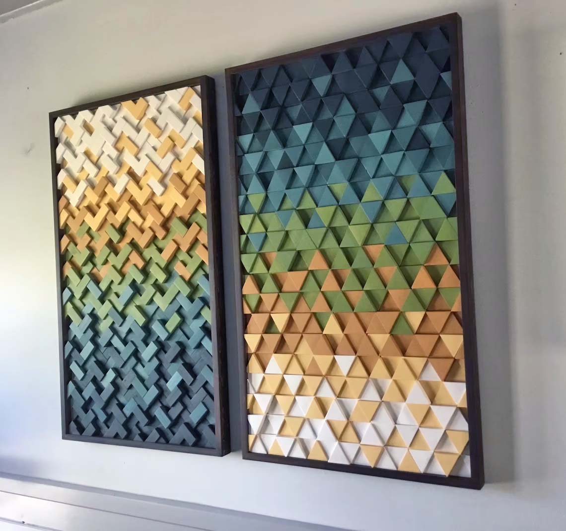 This handcrafted 2pc set includes 1 herringbone design sculpture and 1 triangle design sculpture both incorporating gradient tones of blue, green, orange, yellow and white, finished off with handmade frames in expresso wood tone? These 2 designs are fully customizable in size and color tones as well, feel free to contact with any questions you may have.