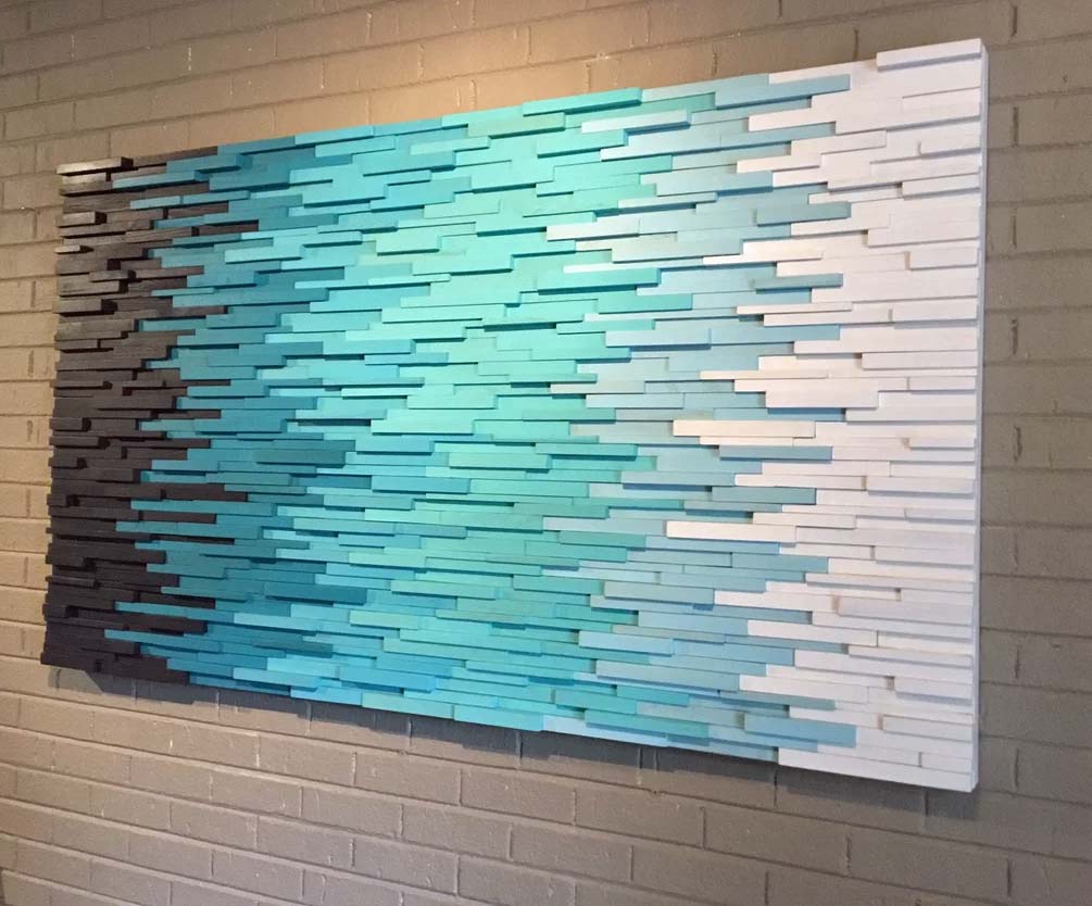 This modern wood wall sculpture we call “ Transition Through Blue “ was created using some of our favorite blue tones and portrays a fresh yet abstract feel.
