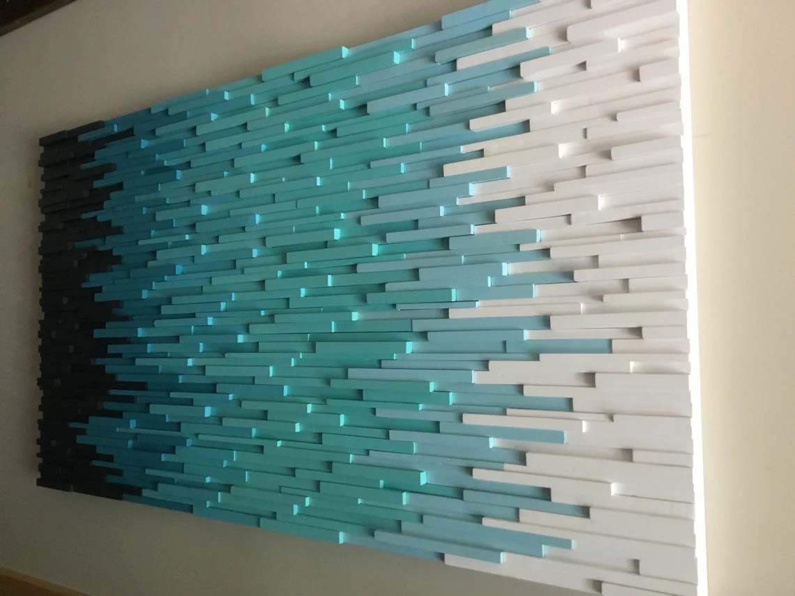 This is a handcrafted modern wood wall art piece that is made out of reclaimed and up cycled wood. To achieve this sculpture each piece of wood had to be individually ripped, cut, sanded, painted and assembled. This piece would be the focal point of any space whether it be home or office. This piece was painted in a Ombre style starting with a dark shade of blue fading to white. This piece would look great in various sequences of colors.