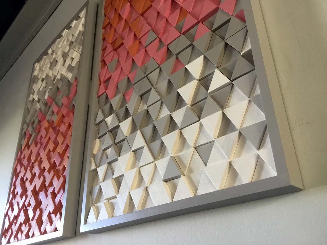This handcrafted 2pc set includes 1 herringbone design sculpture and 1 triangle design sculpture both incorporating color tones of orange,pink, gray and white, finished off with handmade gray painted frames. These designs are fully customizable in size and color tones as well, feel free to contact with any questions you may have.