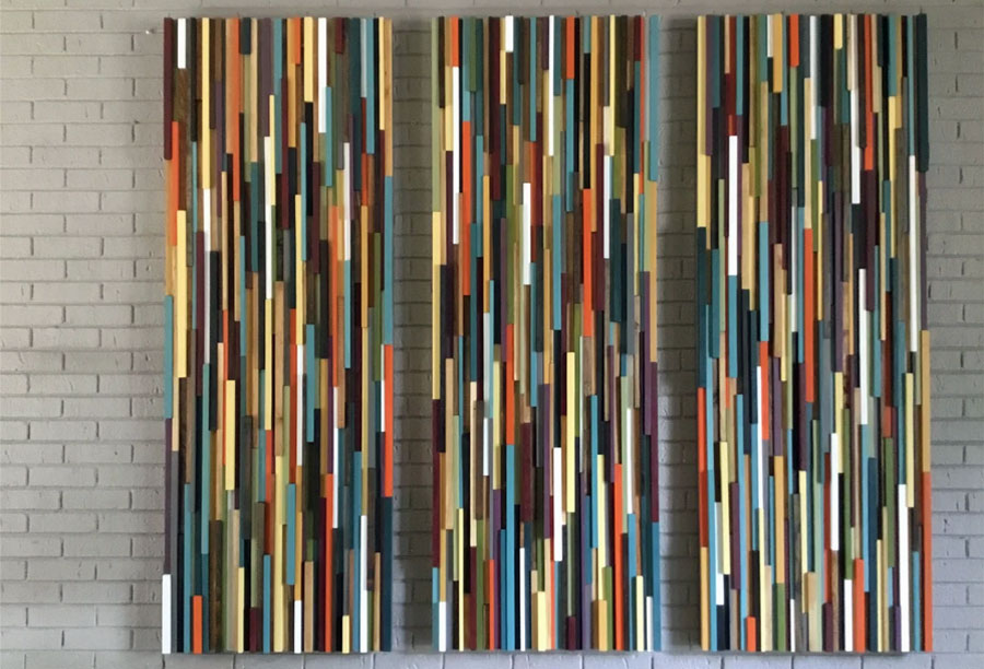 This beautiful and colorful three piece sculpture was created using a mid century modern color pallet consisting of 3 individual panels measuring 22”w X 70”h each. In addition to displaying as a spaced set, this sculpture was also designed so when placing the 3 panels side by side in sequence, it creates one huge ,seamless, incredible 6ft. X 6ft. statement piece.