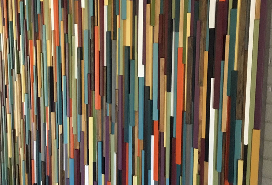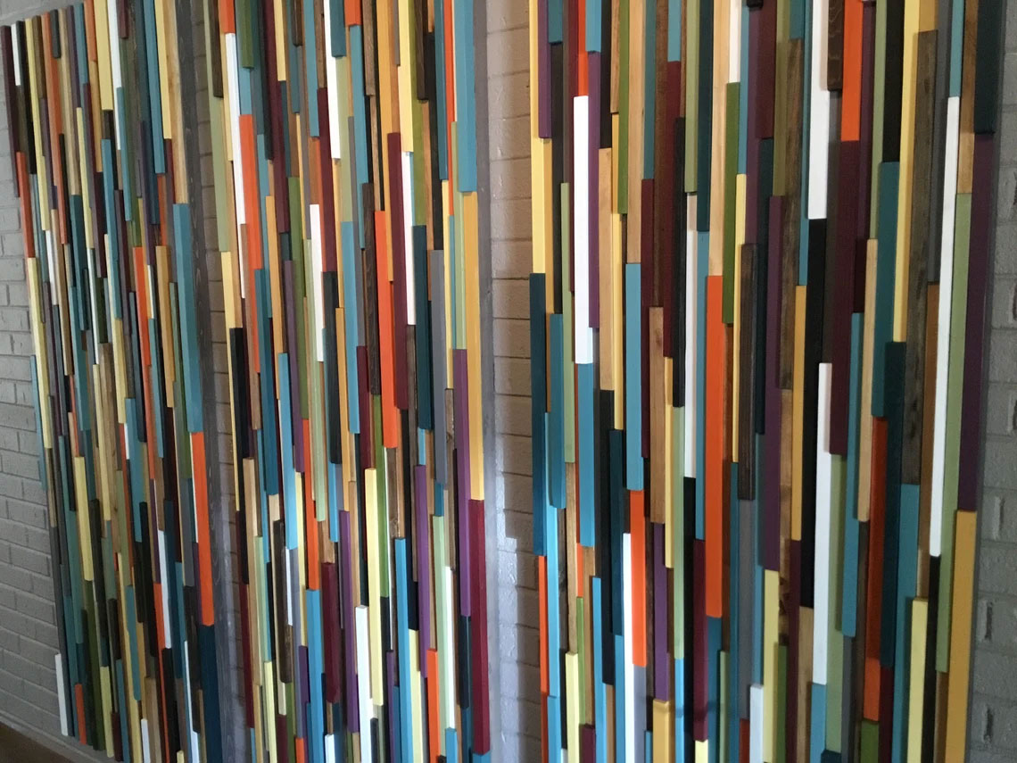 This is a handcrafted modern wood wall art piece that is made out of reclaimed and up cycled wood. To achieve this sculpture each piece of wood had to be individually ripped, cut, sanded, painted and assembled. This piece would be the focal point of any space whether it be home or office. The colors include a series of teal, grey, red, orange, white, blue, green, yellow and stained brown pieces. Also this piece is frame less to convey a more modern vibe.
