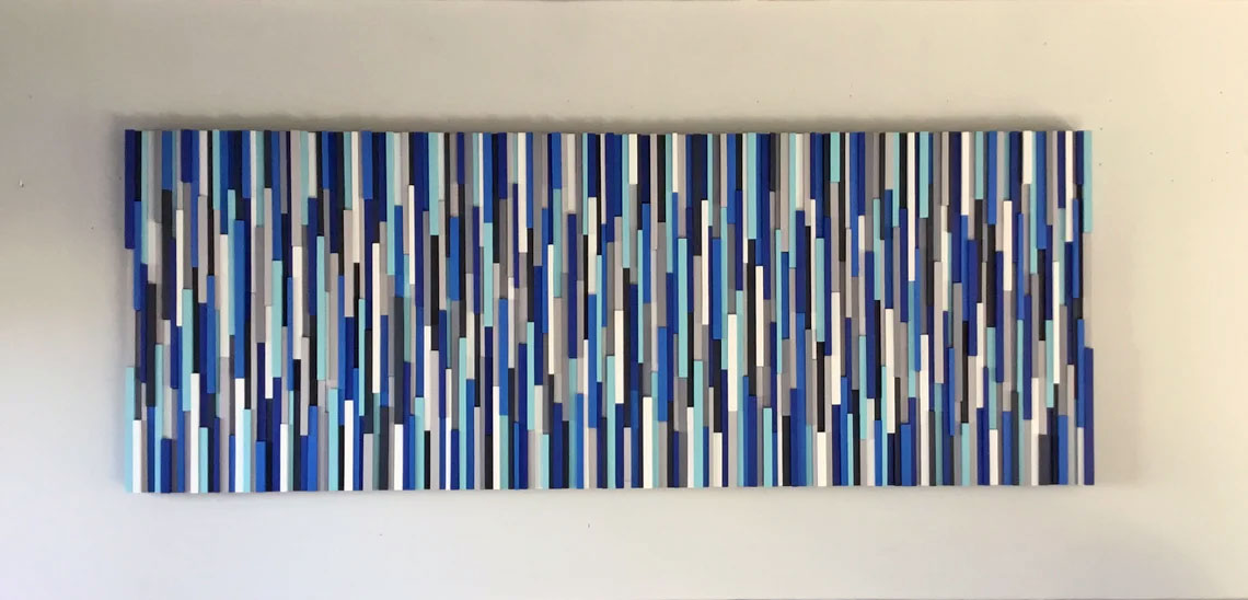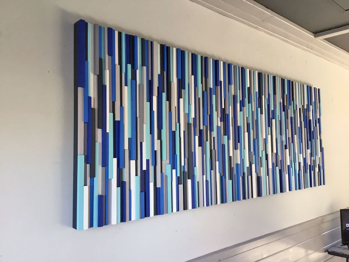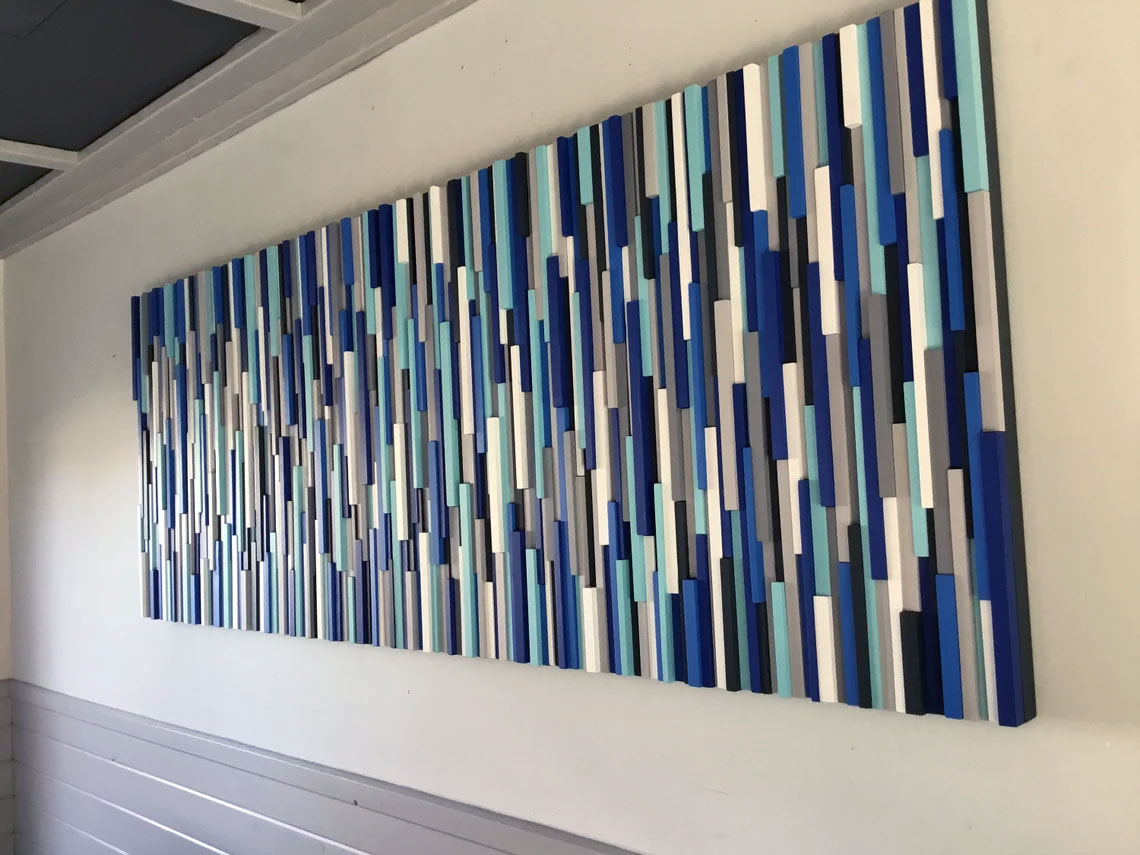 Mid-century modern dimensional wood wall sculpture incorporating series of blues, grays, black and white color tones. This is a handcrafted modern wood wall art piece that is made from new, reclaimed and up cycled wood material. To achieve this sculpture each piece of wood had to be individually ripped, cut, sanded, painted and assembled. This piece would be the focal point of any space whether it be home or office.