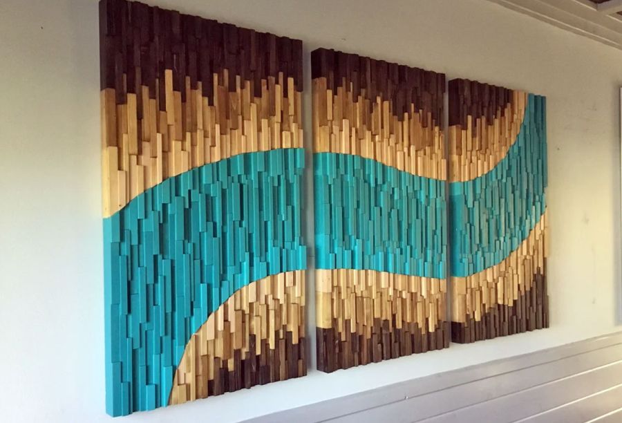 - Materials: wood glue, acrylic paint, plywood backing, and nails, reclaimed and upcycled wood scraps