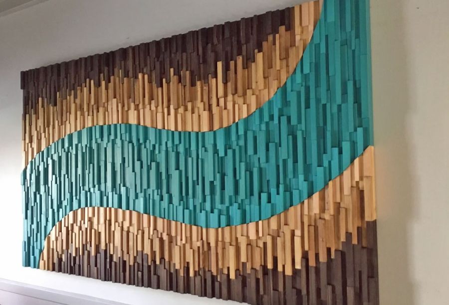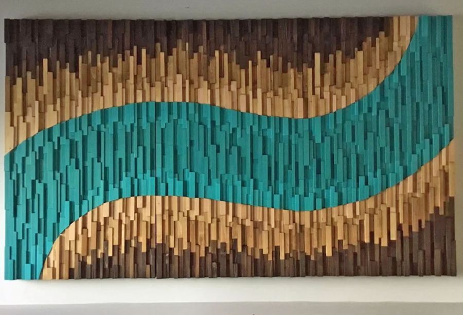 Elevate your space with this unique, handcrafted wall sculpture. Made entirely from reclaimed and upcycled wood, this modern piece is a testament to sustainable design and meticulous craftsmanship. The frameless design highlights the striking geometric pattern, which features a beautiful palette of deep blues, soothing light blues, and earthy stained browns. The "Rio Grande" is more than just decor—it’s a statement piece, ready to become the focal point of your home or office.