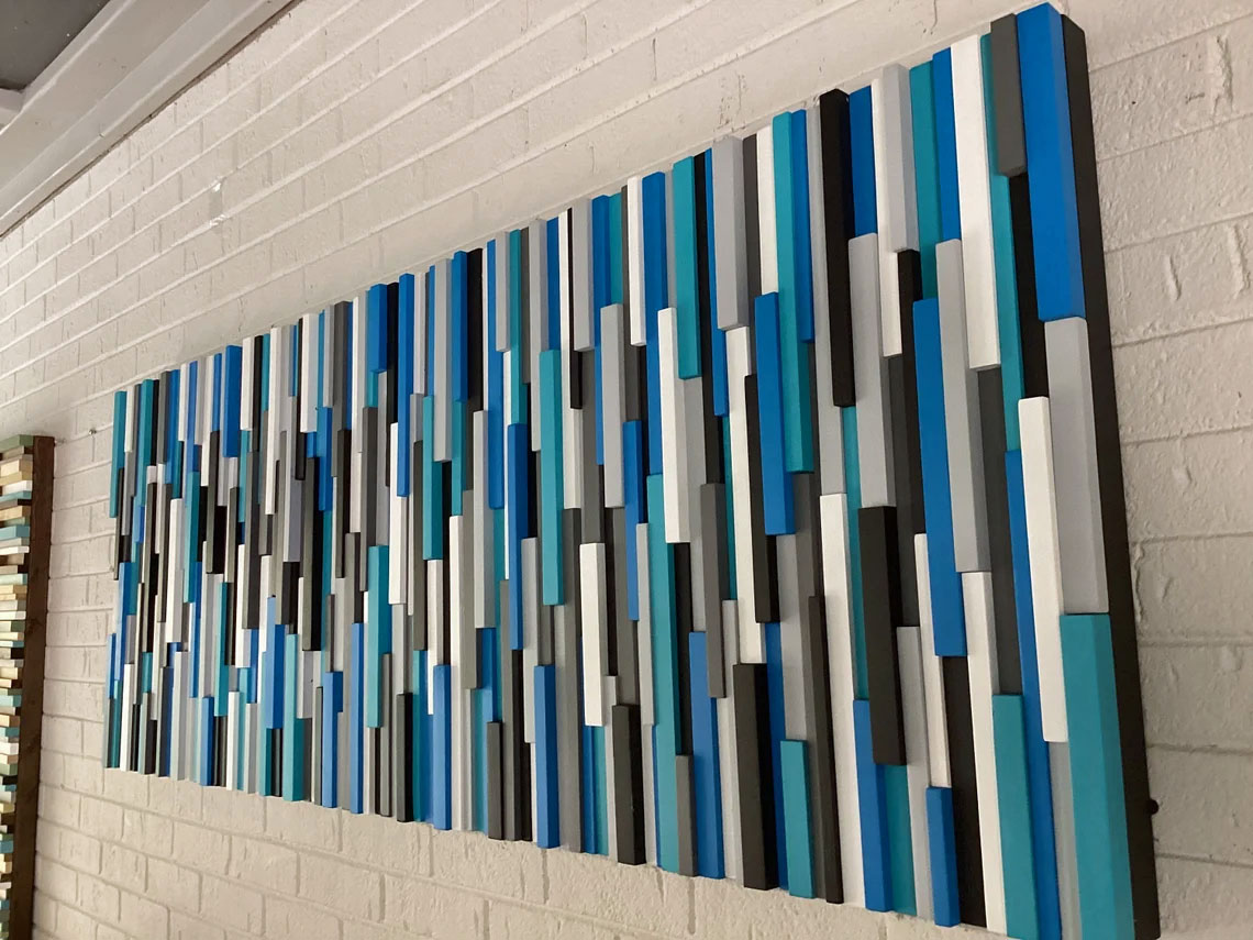 This piece was inspired by the Carolina Panthers, from our home state.This is a handcrafted modern wood wall art piece that is made out of reclaimed and up cycled wood.To achieve this sculpture each piece of wood had to be individually ripped, cut, sanded, painted and assembled.This piece would be the focal point of any space whether it be home or office.The colors include a series of official Carolina Panthers blue, black silver and white. Also this piece is frame less to convey a more modern vibe.