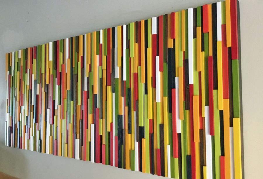 - Materials: Reclaimed and upcycled wood, Plywood backing, Premium acrylic paints, Wood stain, Glue, Nails
