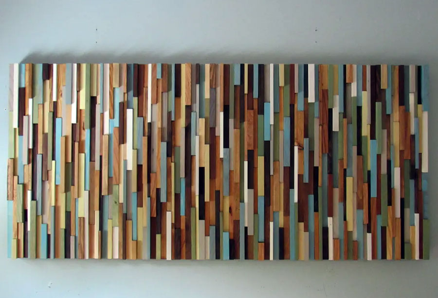 This is a handcrafted modern wood wall art piece that is made out of reclaimed and up cycled wood. To achieve this sculpture each piece of wood had to be individually ripped, cut, sanded, painted and assembled. This piece would be the focal point of any space whether it be home or office. The colors include a series of light blue, grey, yellow, green and stained brown pieces. Also this piece is frame less to convey a more modern vibe.